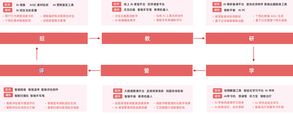 通過多樣化的軟硬件產品服務,實現“招 - 教 - 研 - 學 - 管 - 評”全場景智能化升級,構建起覆蓋“營銷 + 教學 + 管理