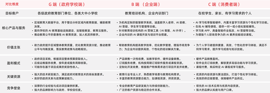 G 端圍繞政府教育管理需求,B 端聚焦 教育機構的定制化需求,C 端則直接面向個人用戶的教育培訓個性化需求;在客戶、產品、盈利等維度