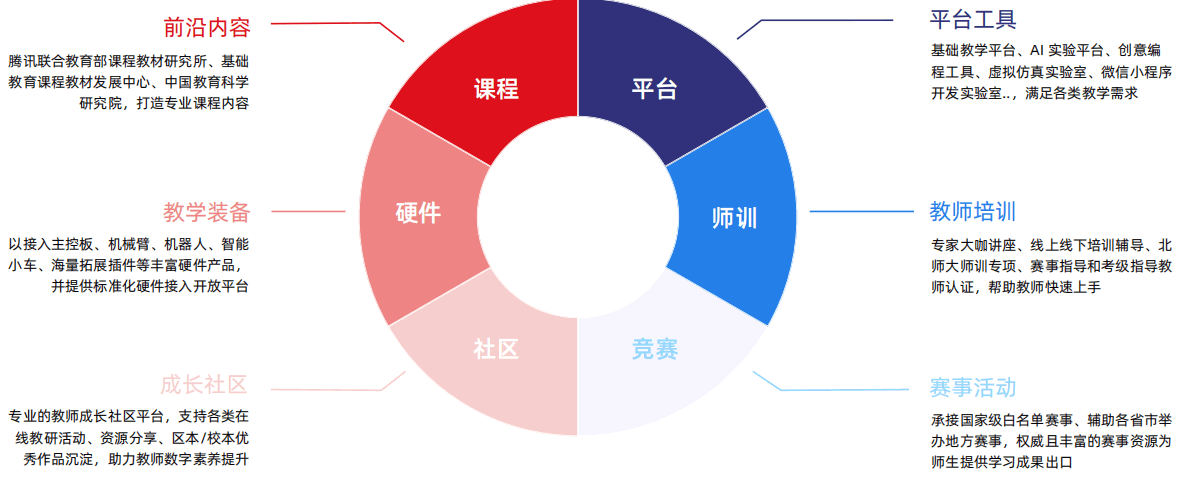 打造出融合技術、產品、服務、知識的一站式的解決方案,包括基礎教學平臺、 AI 實驗平臺、豐富編程工具、優質課程資源以及師資培訓和賽事