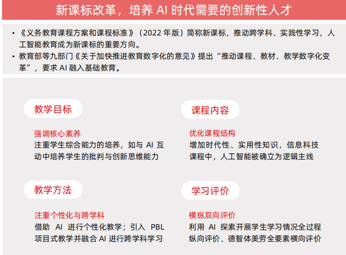 中國教育部順應 AI 時代人才素養(yǎng)體系需求,通過新課標改革啟動教育供給側結構性調整:2022 版新課標首次將人工智能納入義務教育課程體系,并聯(lián)合九部門推動教育數(shù)字化,明確要求課程內容與 AI 產(chǎn)業(yè)需求動態(tài)對接;